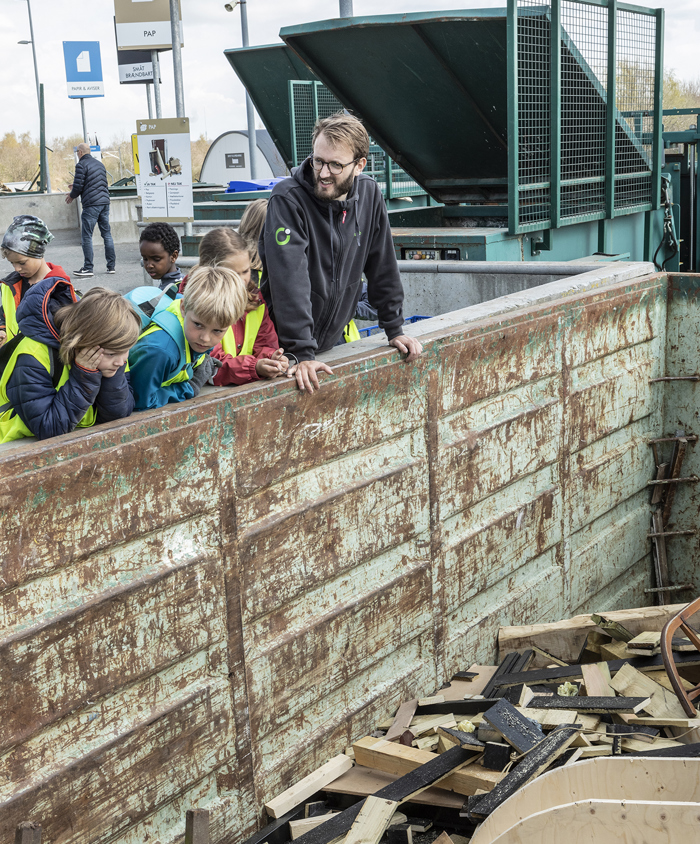 Klassen besøger en moderne genbrugsstation og lærer, hvad der sker med deres affald, når de sorterer og genbruger.
